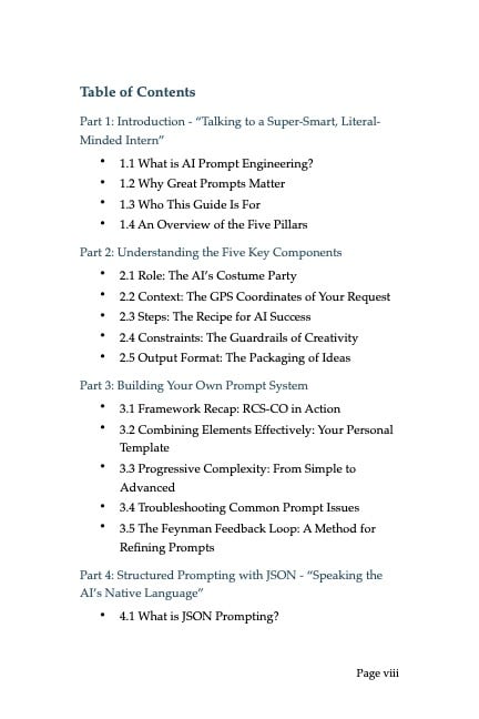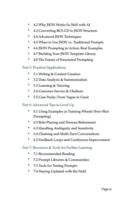 • The RCS-CO Framework - A 5-step system that eliminates guesswork and delivers consistent results • JSON Prompting - Advanced structured techniques used by AI professionals (but explained for beginners) • Real-World Applications - From writing emails to analyzing data, see the framework in action across 20+ practical scenarios • Advanced Techniques - Few-shot prompting, persona refinement, and conversation chaining that separate amateurs from experts • Troubleshooting Guide - Never get stuck with a bad AI response again